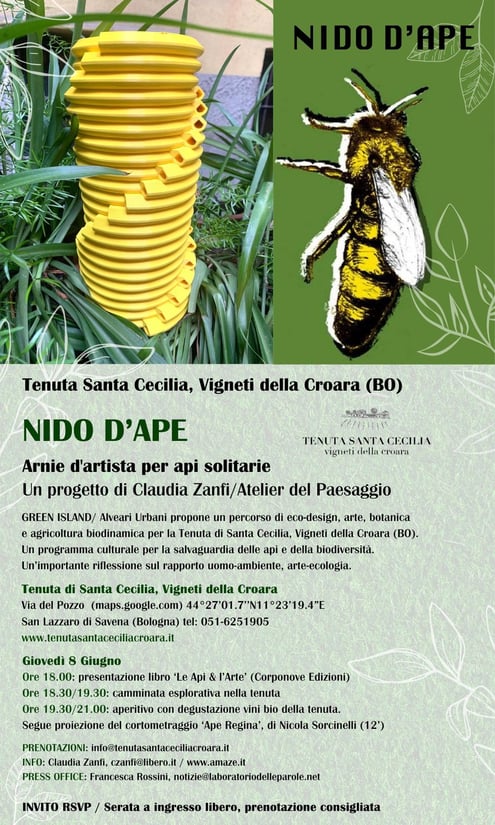 Giovedì 8 giugno, alle 18:00, presso Tenuta Santa Cecilia, è in programma un percorso di eco-design tra arte, botanica, e agricoltura biodinamica, a seguito della settimana Mondiale delle Api. Momento cardine dell’evento sarà l’installazione della prima arnia artistica NIDO D’APE per api solitarie, dette Osmie, insetti utilissimi per l’impollinazione di fiori, frutta, verdure, vigneti. Realizzato insieme allo studio di progettazione e design CARACOL (innovativa start up milanese) questo particolare progetto vede l’utilizzo della stampa 3D e di un materiale ecologico come l'acido polilattico, biodegradabile e compostabile, derivato dalla trasformazione degli zuccheri di origine naturale (barbabietole, mais, canna da zucchero), in grado di soddisfare aspetti di biocompatibilità con l’ecosistema e con l’ambiente. Il progetto ha inoltre ricevuto la menzione “Sostenibilità” durante Milano Design Week2022, tra oltre 750 progetti internazionali.