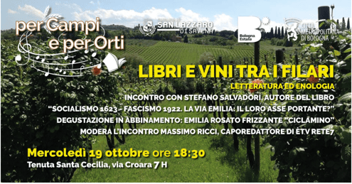 MERCOLEDì 19 OTTOBRE 2022, ORE 18.30 Stefano Salvadori presenta il suo libro "Socialismo 1623 - Fascismo 1922. La via Emilia: il loro asse portante?". Modera l'incontro Massimo Ricci, caporedattore di èTv Rete7. Si degusta Emilia Rosato Sui Lieviti IGT CICLAMINO.